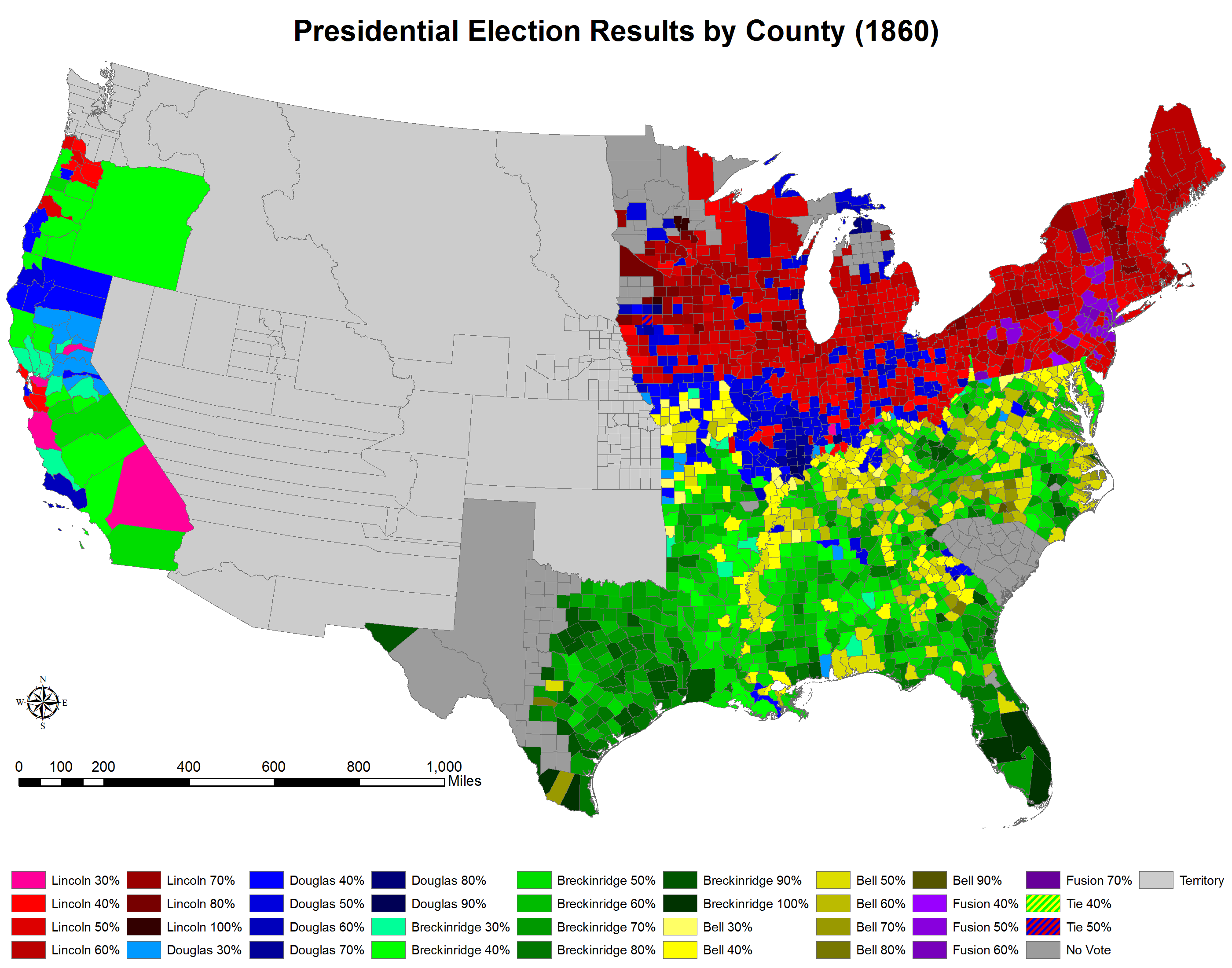 The 1860 Presidential Election was one of the most consequential elections in world history, since it directly triggered the American Civil War. (Others on the shortlist include the series of three Reichstag elections in 1932-3). It was in response to the election of Abraham Lincoln that the first tranche of slave states seceded, and Lincoln – with the overwhelming support of public opinion in the North – responded to secession with war. Lincoln didn’t need to do anything to prompt secession; it was enough that a Republican, elected entirely on the basis of the votes of the free states, had come to power. Although you’ll read otherwise on neo-Confederate blogs, Southerners at the time were not shy about telling the world that their motives were to protect slavery. One prominent Southerner, William Lowndes Yancey boldly (bravely? provocatively?) campaigned in the North during the 1860 election campaign, warning an audience in Boston (the home of antislavery politics) that while the South could concede on minor issues like tariffs, they would never yield over slavey, “the tool of our industry, the source of our prosperity”.