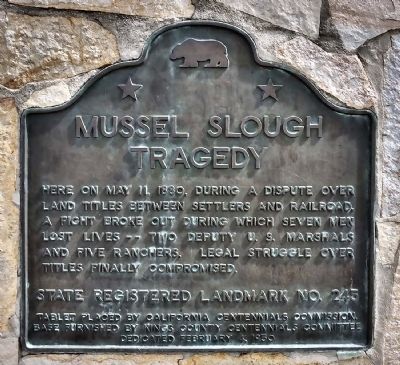 The story of the Mussel Slough gunfight raises questions not only about political tension in the nineteenth century West at a moment of corporate consolidation, but also about the difficulties of recovering the reality of the conflict from beneath multiple layers of propaganda. (I’ve written a post summarizing some of the historiography here.) In essence – to cut a very long story short – men lost their lives at Mussel Slough because the railroad got a court order to evict from a plot of land a settler who had not paid for the plot but was claiming the right to it, or at least to buy it cheaply. The railroad, said the courts, owned the land and could therefore sell it to whoever they chose and whatever price the market would bear. The settlers thought they were being railroaded – what they called their “Little Eden” sold from under them.