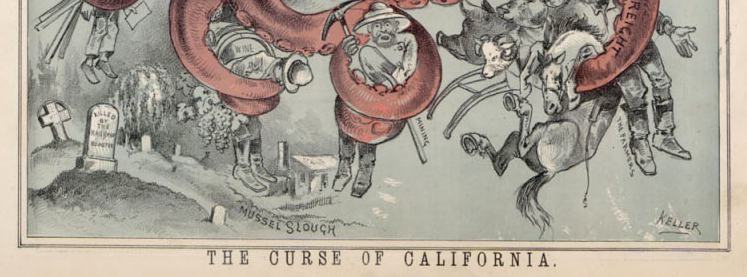 As I stood on the edge of the highway, there was no sign of any one else – the occasional car sped past, and in the distance I could hear the hum of some kind of farm machinery, but that was it. There was a concrete memorial there, though, to commemorate a gunfight in 1880 in which seven people lost their lives. For a while the killings at this place – then known as Mussel Slough (pronounced slew apparently, though at the time I assumed it was the same as the place that friendly bombs were supposed to drop on)– electrified the country and even caught the attention of London newspapers. It inspired sage commentary from Karl Marx on the coming crisis of capitalism he thought it betokened. (Marx would, I like to think, have pronounced the place name to rhyme with plough, as in ‘slough of despond’). A few years later, a novel The Octopus: A Story of California featured a lightly fictionalized account of what occurred at Mussel Slough. It became fixed in the minds of Californians and Americans generally as a shocking example of the callousness of a big corporation – the Southern Pacific Railroad in this case, whose power over Californian life and politics in this period was legendary.